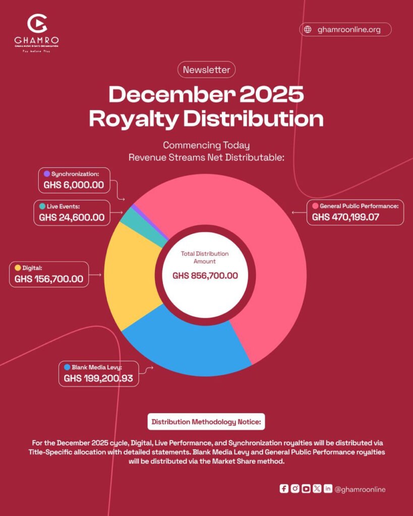 The Ghana Music Rights Organisation (GHAMRO) has officially commenced its December 2025 royalty distribution, releasing a total of GH₵856,700.00 to rightsholders across multiple revenue streams. This distribution covers Digital, Live Events, Synchronisation, Blank Media Levy and General Public Performance. Beyond the headline figure, the breakdown of the funds reveals an important story about where music money is truly coming from and how it is being shared.